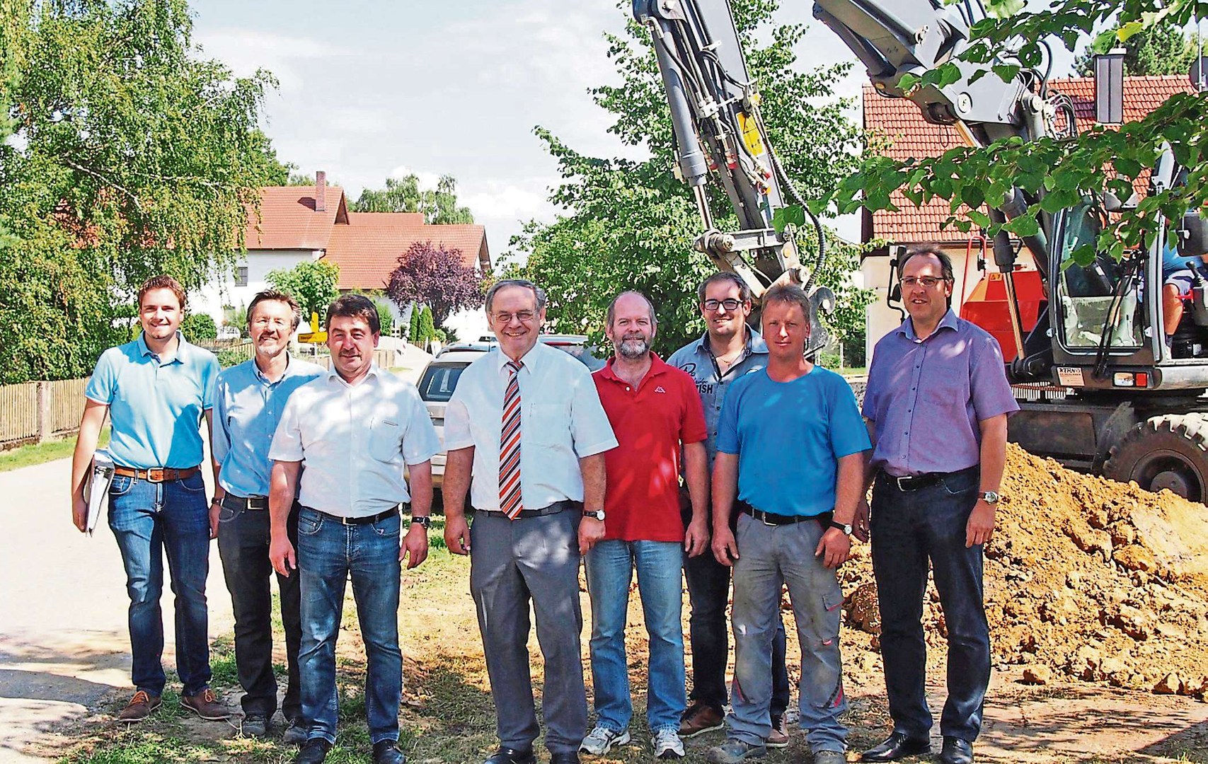 Bild (von links): Lukas Troiber und Xaver Fleischmann (Ingenieurbüro KEB), Bürgermeister Neumeier, Verbandsvorsitzender Frank, Horst Roithner (Wasserzweckverband), Bauleiter Manuel Christl und Polier Stefan Kastl (H & T) sowie Geschäftsleiter Manfred Engl (Wasserzweckverband). (Foto: en)