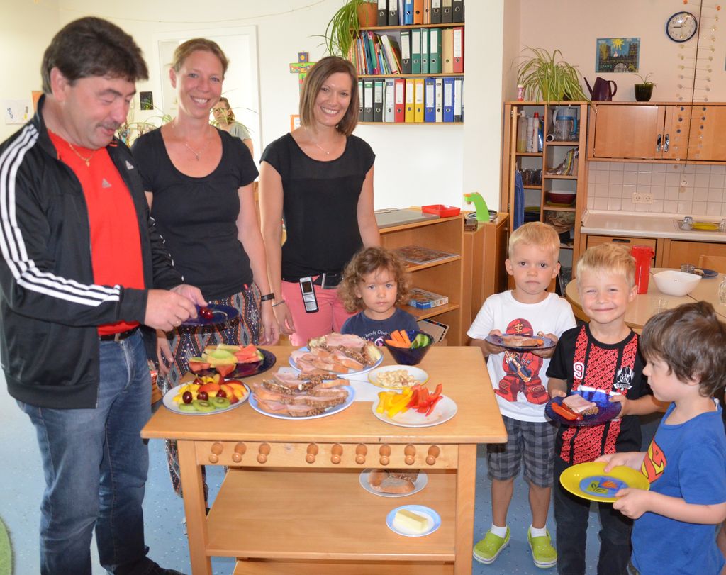 Foto: Bürgermeister Alfons Neumeier und die Erzieherinnen Manuela Schlösser und Bianca Breböck (von links), mit Kindern bei der „Gleitenden Brotzeit“
