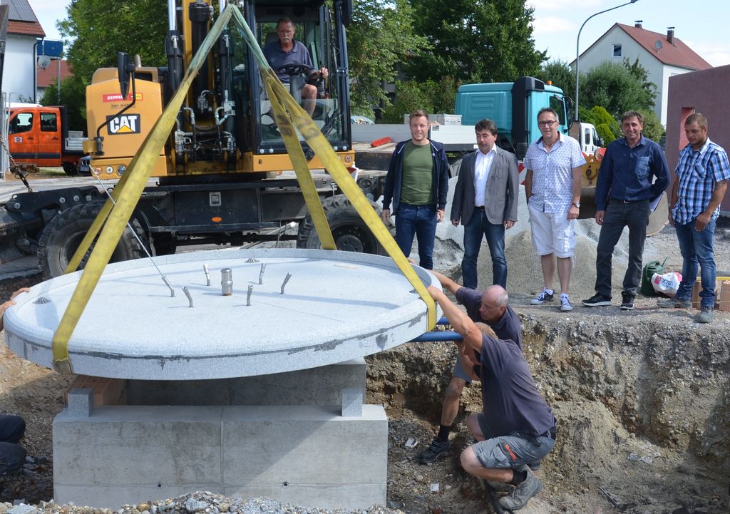 Salching.(jb) Im Rahmen der kleinen Dorferneuerung Oberpiebing und der damit verbundenen Neugestaltung des Kirchenvorplatzes, erhielt der Dorfbrunnen von 1995 neben dem Pavillon einen neuen Standplatz. Dabei wurde die gesamte Technik erneuert, sowie die marode Abdeckplatte aus Beton durch eine Granitplatte ersetzt. Circa 20 Meter vom Brunnen entfernt wurde ein 12 Meter tiefer, mit Ziegel (Reichsformat) ausgemauerter früherer Hausbrunnen wieder aktiviert. Eine Glasplatte und eine Beleuchtung erlauben einen sicheren Blick in die Tiefe des Brunnens. Mit dem Wasser daraus wird künftig die Brunnenstube des Dorfbrunnens gespeist. Am Donnerstag wurde durch Facharbeiter der Firma Swietelsky unter Bauoberleiter Franz Schmid von der Architekturschmiede Kirchdorf im Wald, die über eine Tonne schwere Granitplatte auf den Dorfbrunnen gesetzt.