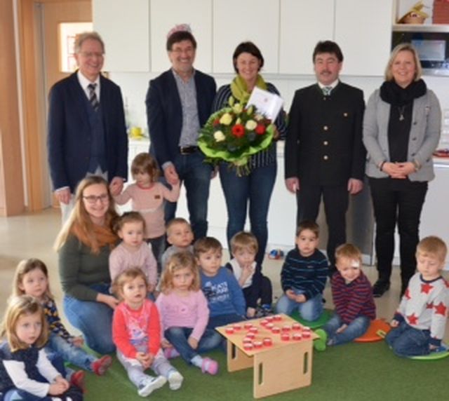 Salching.(jb) Mit einer kleinen Feier, am Donnerstag, auf ihrem Arbeitsplatz, der Kindertagesstätte (Kita) Sankt Nikolaus der Gemeinde Salching, beging die Erzieherin Kornelia Ammer, stellvertretende Kita-Leiterin und Leiterin der Kinderkrippe, ihr 25-jähriges Dienstjubiläum bei der Gemeinde Salching. In seiner Laudatio würdigte Bürgermeister Alfons Neumeier die langjährige Dienstzeit von Kornelia Ammer, die im Januar 1993 als Leiterin des eingruppigen Kindergartens im Pfarrheim Oberpiebing begann. Als der Kindergarten in der Folgezeit wegen des wachsenden Bedarfs mehrmals erweitert werden musste, war Kornelia Ammer maßgeblich an der Planung beteiligt. 2004 war sie bereits Leiterin eines dreigruppigen Kindergartens. 2008 kam ihr Sohn Elias zur Welt und 2010 folgte Sohn Levi. Damit verbunden war eine längere Dienstpause wegen der Elternzeit. Während dieser Zeit absolvierte sie eine Weiterbildung zur Krippenpädagogin. 2011 kehrte Ammer wieder zur Kita zurück und übernahm die inzwischen neu geschaffene Kinderkrippe. Mit Hilfe von Kornelia Ammer entwickelte sich die Betreuungseinrichtung Sankt Nikolaus in Oberpiebing zu einer zeitgemäßen und modernen Kita, machte der Bürgermeister deutlich. „Darum ist Kornelia Ammer ein Gewinn für die Gemeinde“, sagte Neumeier. Mit einer Urkunde und einem Buchgeschenk bedankte sich der Bürgermeister bei der Jubilarin für ihre Dienste. Der Geschäftsstellenleiter der VG-Aiterhofen Günter Stephan stellte den großen Erfahrungsschatz von Kornelia Ammer heraus, der der Gemeinde nach 25 Jahren Erziehungsarbeit zugute komme. Nach den großen Gratulanten, gratulierten auch die Kleinsten. Nacheinander traten sie vor „ihre Konny“ und überreichten ihr rote Rosen.