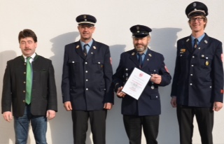Foto: Josef Strigl (Dritter von links) mit (von links) Bürgermeister Alfons Neumeier, Kommandant Manfred Gierl und Vorsitzendem Reinhard Bayerl) bei der Urkundenverleihung