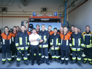 Bild: Bürgermeister Alfons Neumeier (weißes Hemd) überreicht die Wärmebildkamera an den 1. Kommandanten Günter Mauerer (rechts vom BGM) im Beisein von 1. Vorsitzenden Martin Scherm (links vom BGM) und 2. Kommandanten Thomas Abendhöfer (ganz rechts) sowie der aktiven Mannschaft.
