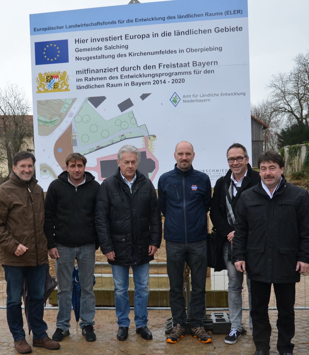 Salching/Oberpiebing. (jb) Bürgermeister Alfons Neumeier hat es bei der Bürgerversammlung vor zwei Wochen verkündet: „Die Bauarbeiten der Dorferneuerung Oberpiebing beginnen noch vor Weihnachten.“ Am Freitagmittag gab der Bürgermeister, im Beisein von Vertretern der Gemeinde Salching, der Architekturschmiede Kirchdorf und des Bauunternehmens Swietelsky, am Dorfplatz in Oberpiebing den Startschuss zum Baubeginn. Bei den Baumaßnahmen handelt es sich um die Neugestaltung des Kirchenumfeldes im Bereich der Linde beim Friedhofsaufgang, bis zur Kirchmattinger Straße und dem weiteren Verlauf der Straße und der parallellaufenden Friedhofsmauer, auf einer Länge von circa 65 Meter, die Breite beträgt circa 40 Meter.