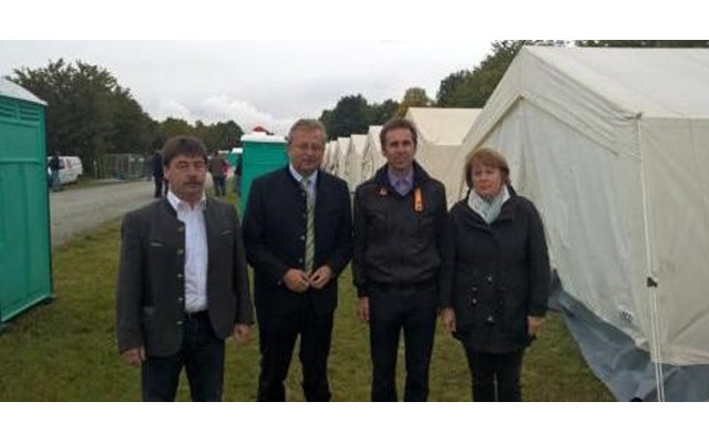 Landrat Josef Laumer, Bürgermeisterin Barbara Unger aus Feldkirchen und Bürgermeister Alfons Neumeier aus Salching haben sich über die aktuelle Situation im „Wartebereich“ der Flüchtlinge auf dem Areal der Gäubodenkaserne informiert. Der Camp-Leiter vom Bundesamt für Migration und Flüchtlinge (BAMF), Hans Kirchinger, erläuterte das Aufnahmeverfahren der Flüchtlinge: Die ankommenden Asylbewerber werden registriert und verbleiben ein bis drei Tage in Mitterharthausen, ehe sie deutschlandweit an die für sie zuständige Stelle vermittelt werden. Bis Dienstag seien knapp 1000 Personen angekommen, so Kirchinger, viele seien bereits weiterverteilt worden. Die Zahl werde sich jedoch erhöhen, wenn auch zukünftig so viele Flüchtlinge den Weg nach Deutschland suchen.